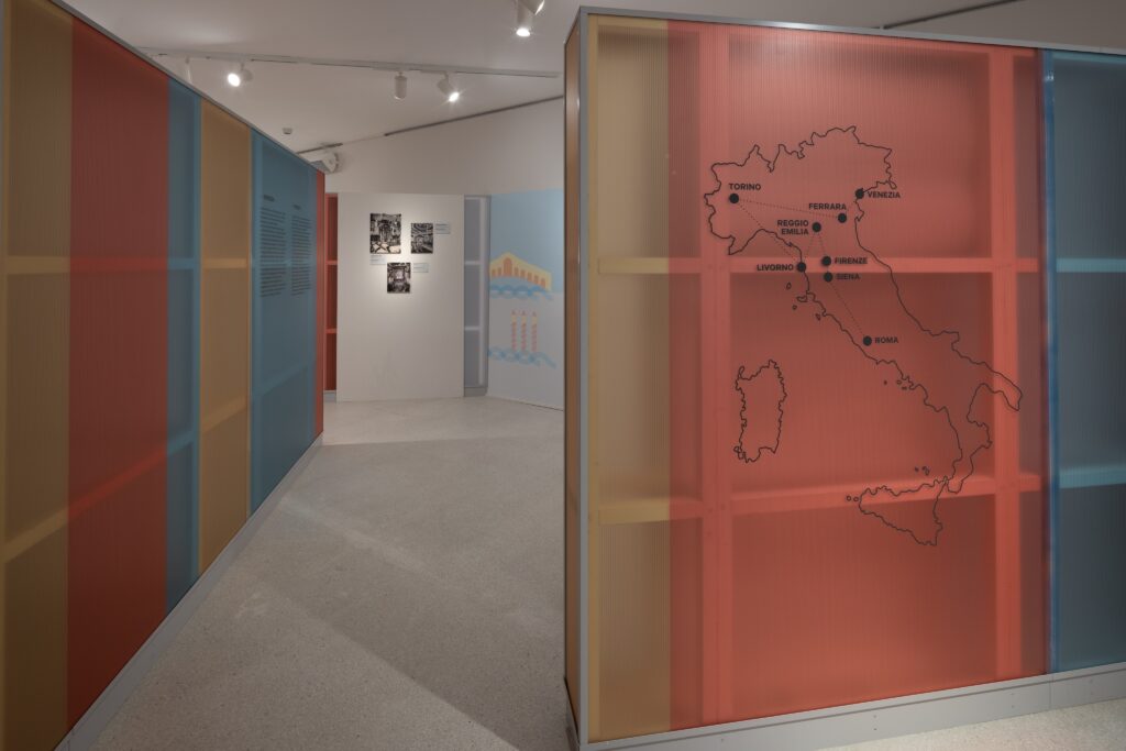 Esporre e valorizzare i documenti dei due fondi fotografici significa custodire un passato che interpella ancora il presente, ricordandoci che la diversità culturale è parte fondante della nostra storia nazionale. Il dialogo – tra storia e attualità, tra generazioni, tra culture differenti – è un concetto che abbiamo scelto di riprendere anche nel nostro lavoro. Per creare una connessione tra comunicazione e allestimento, abbiamo voluto utilizzare campiture colorate e semi-trasparenti di diverse misure, che evocano gli elementi in policarbonato all’interno del percorso espositivo. La gamma colori è fresca e contemporanea, pensata per valorizzare le opere in bianco e nero e gli oggetti esposti appartenenti al passato.