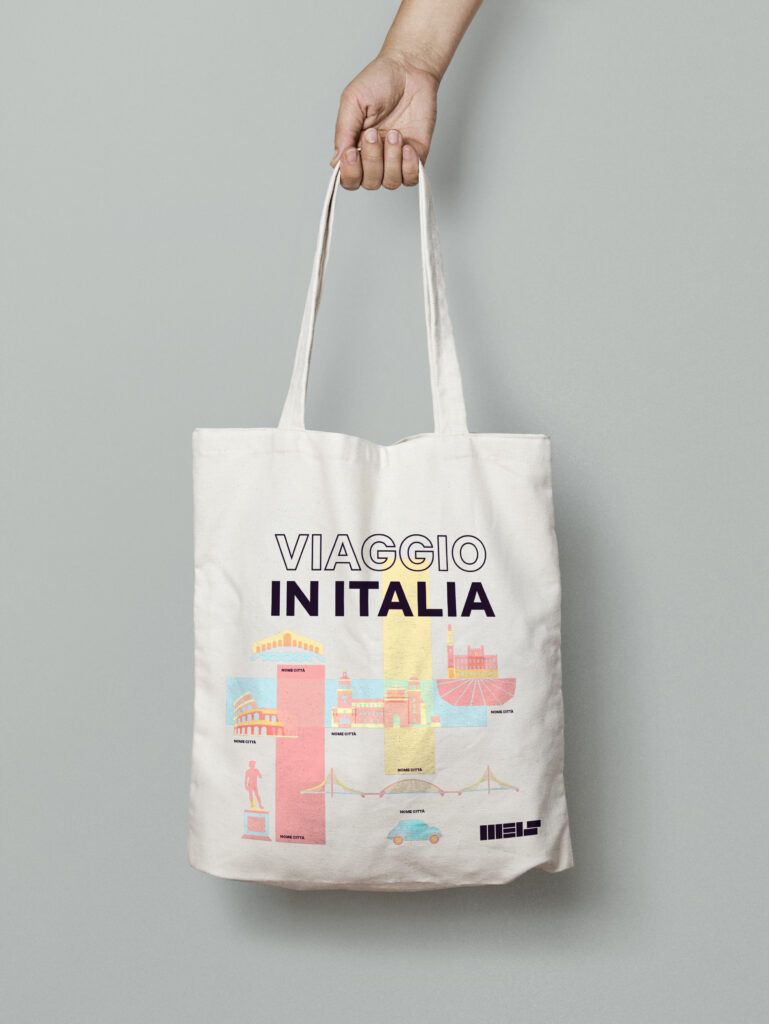 Per la comunicazione della mostra — inviti, manifesti, pieghevoli — è stata scelta una fotografia esposta che trasmette immediatamente il tema dell’esposizione. Colori e trasparenze inseriti nella grafica dialogano con l’allestimento, mentre il titolo è volutamente trattato con due grafie distinte: “viaggio” e “Italia” diventano così visivamente autonomi, a sottolineare il peso specifico di entrambi i concetti. Per il merchandising abbiamo utilizzato le illustrazioni delle città protagoniste della mostra e una semplificazione delle forme cromatiche dell’immagine principale.